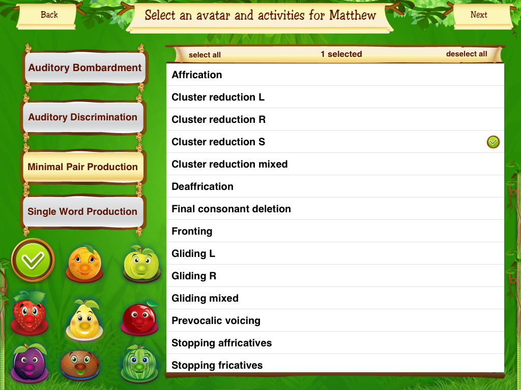 The screenshots above are from the "Flashcard" function. There is also a "Board Game" option. Like in "Flashcards," you select the phonological process you wish to target for each student. To play the board game, the student also selects a game token (a piece of fruit):
